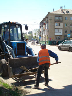 | 6 мая работники КП «Чистота» убирали проезжую часть в центре города. С 02:00 на пр. Б. Хмельницкого работала спецмашина, а утром коммунальщики приступили к ручной погрузке собранного грунта.
