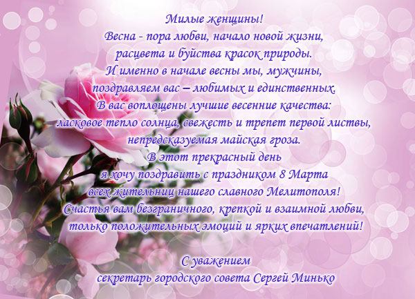 Поздравление секретаря Мелитопольского городского совета Сергея Минько с 8 марта |