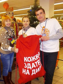 Суть акции состоит в том, что перед входом в торговый зал супермаркета установлена елка, на которой размещены бумажные «шары» с просьбами детей к Деду Морозу о подарках, которые они хотели бы получить к Новому году. | |