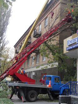 По информации начальника УЖКХ Алексея Тегимбаева, за прошлую неделю коммунальщики выезжали на уборку семи аварийных деревьев на придомовых территориях. На текущей неделе предстоит убрать аварийные деревья по ул. Шмидта, ул. Гоголя, в микрорайоне. Для работ на высоких деревья приходится пользоваться услугами 22-х метровой автовышки, час работы которой обходится в сумму порядка 750 грн. /час. По словам Алексея Тегимбаева, такая автовышка есть в МГРЭС и в ТГАТУ. Руководство Агроуниверситета по мере возможности оказывает необходимое содействие коммунальщикам в этом вопросе.